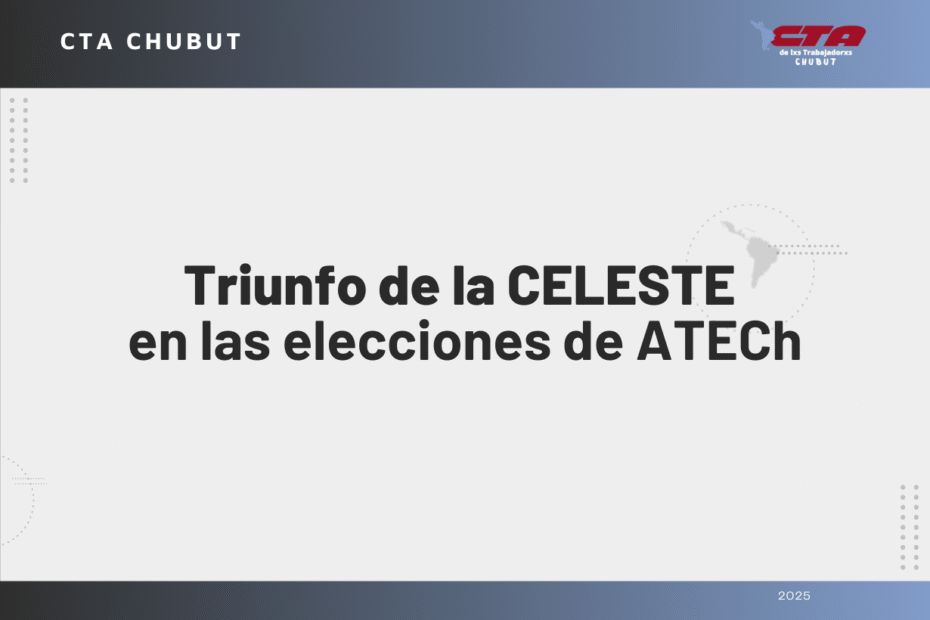 Enorme triunfo de la lista CELESTE en las elecciones de ATECh Provincia de Chubut. La lista CELESTE se impuso en 5 de las 6 Regionales con un apoyo de las y los trabajadores de la Educación. Es una gran noticia… Leer más »Enorme triunfo de la Celeste en ATECh