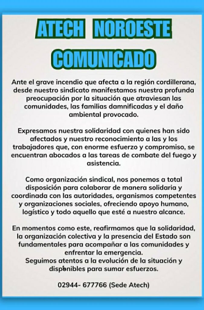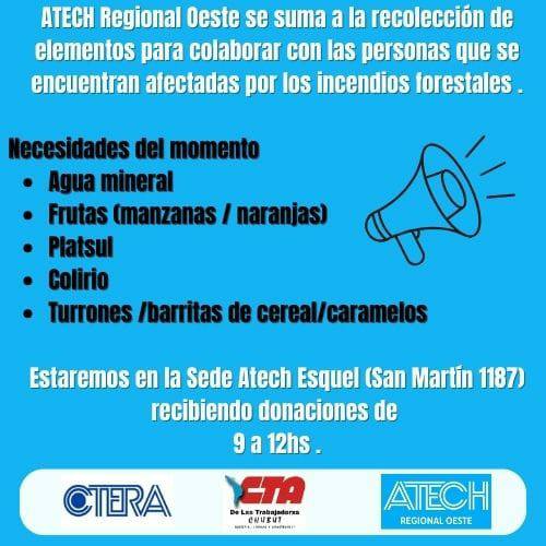 Ante la gravedad que están viviendo vecinas y vecinos de la Comarca Andina por los incendios forestales en Epuyen, El Hoyo, Cholila, parajes aledaños y Parque Nacional Los Alerces, la CTA se suma al trabajo solidario de recopilación de elementos e insumos necesarios para brindar una primer ayuda.